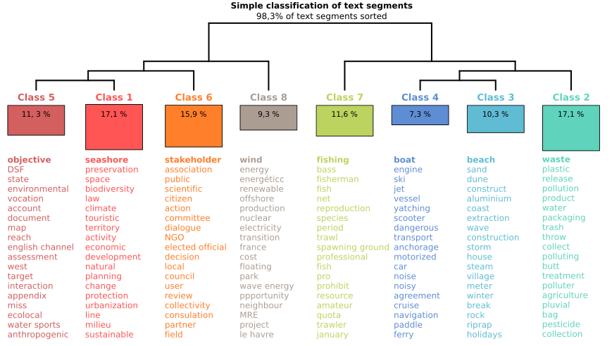 Le groupe 2 assimile les raisons principales de la participation du public, c’est-à-dire : la pollution, l’anthropisation du littoral et la coexistence de différents modes de navigation dans les zones côtière. Ce groupe représente 34% des commentaires.